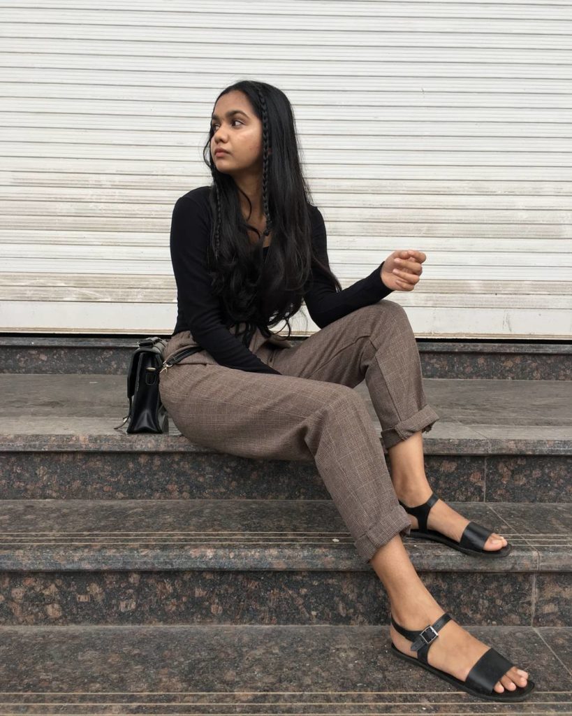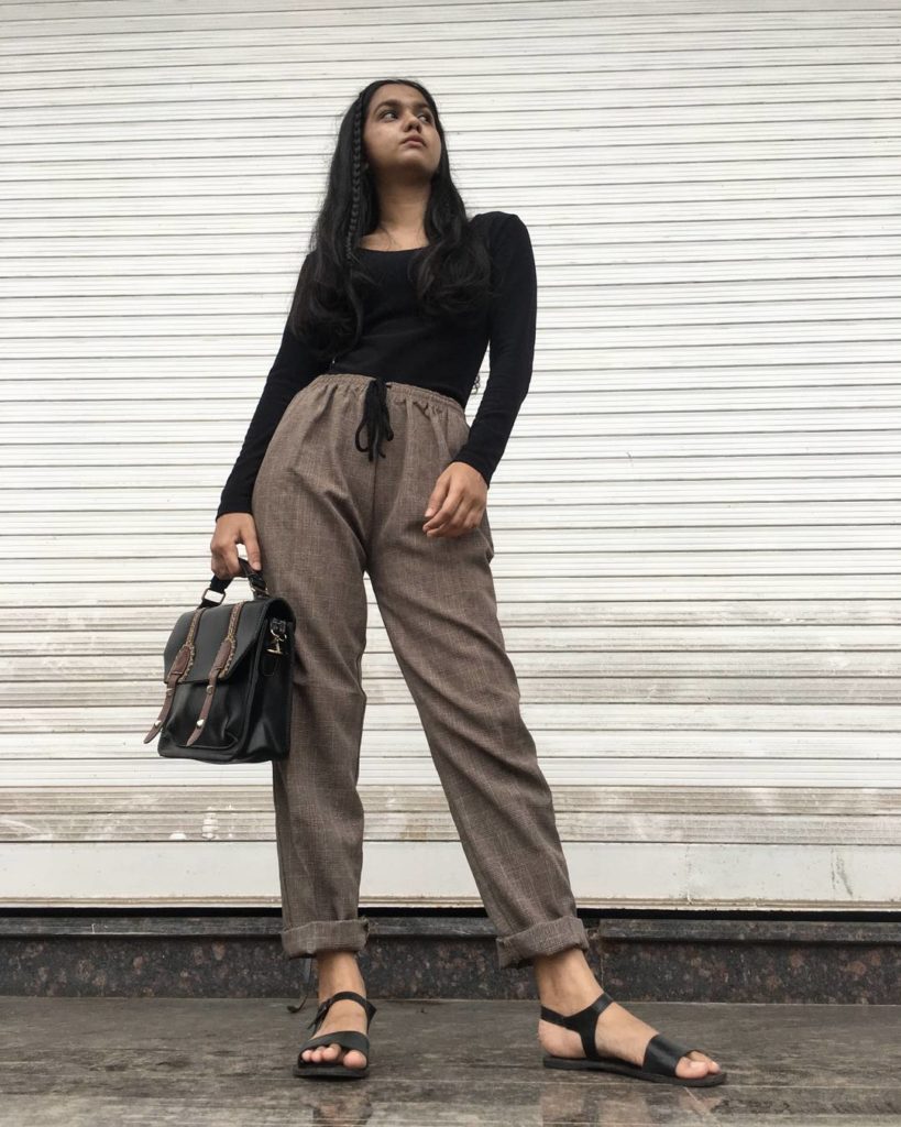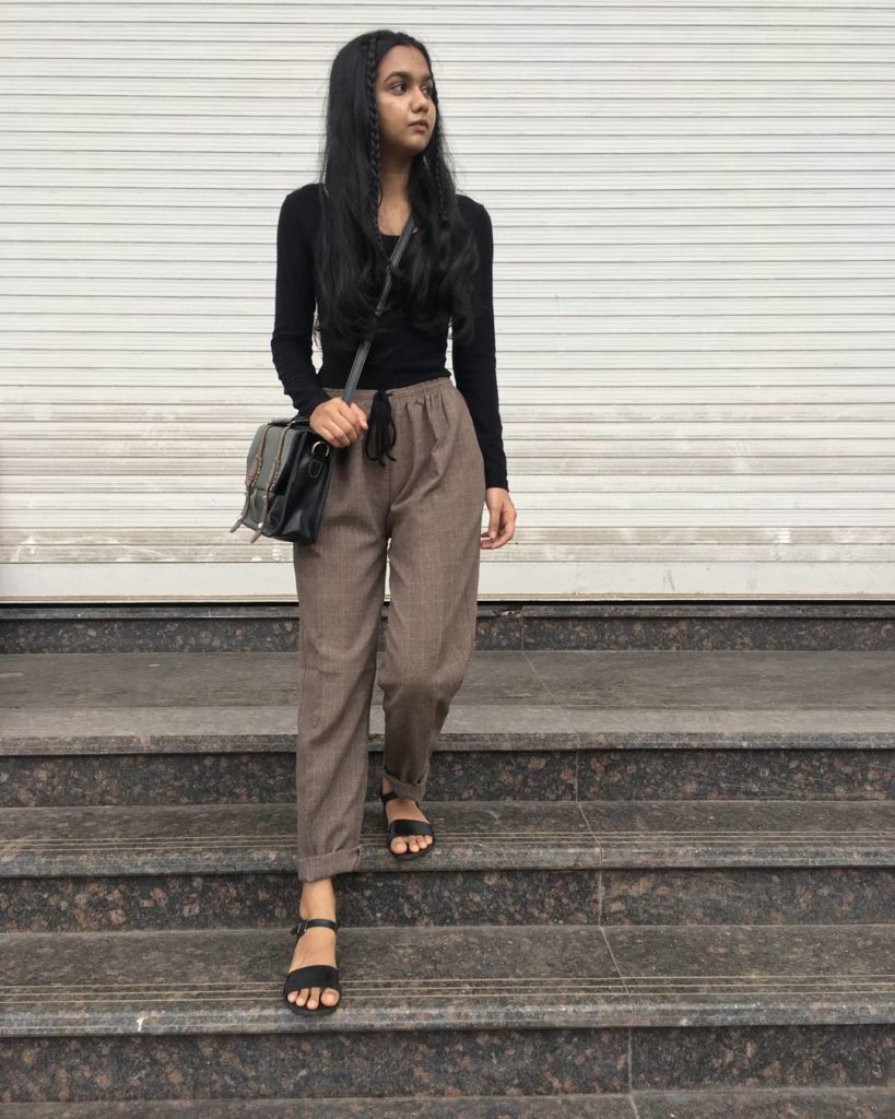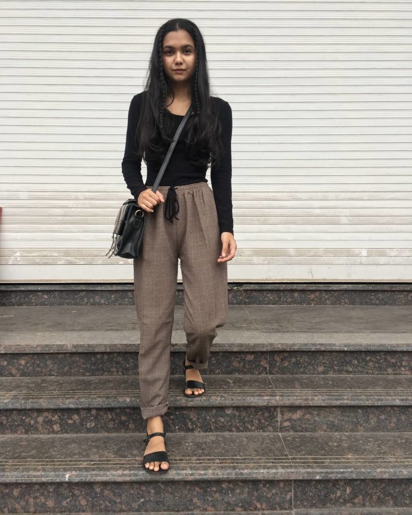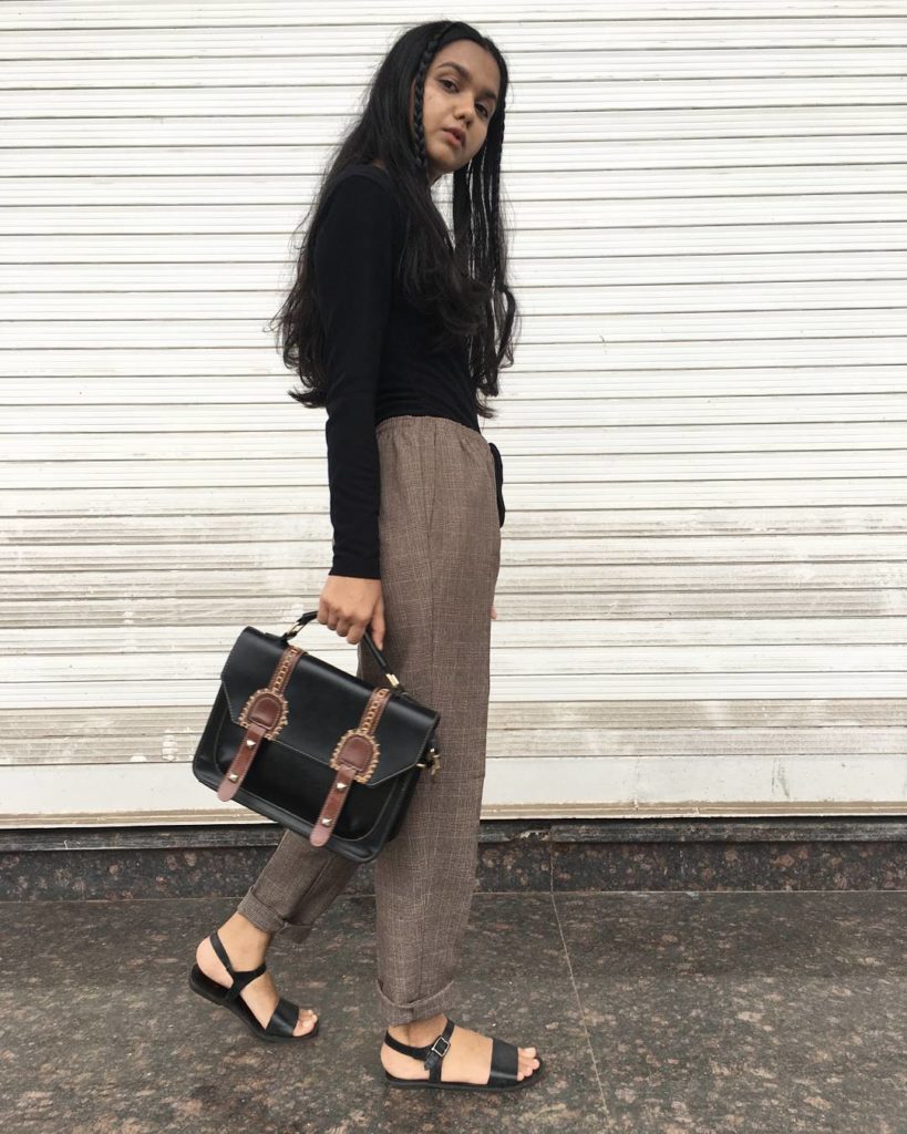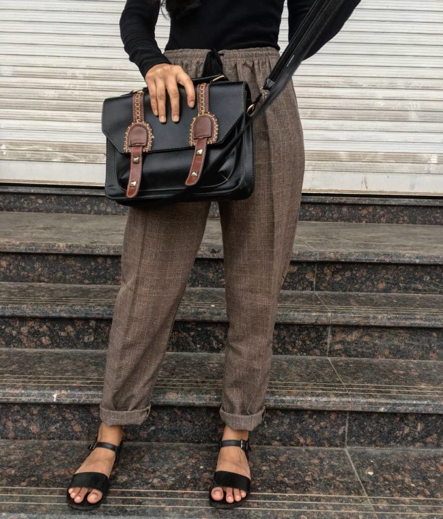 How many of you are familiar with Lady Jamshedji road in Mahim? It’s one of the most weirdly amazing & fascinating places to shop on Wednesday’s. Want to know why? because this place has really random things and it always leaves you surprised. So I created a look from the things I’ve shopped from there which is a checks printed pant, a basic black top & a sling cum handbag. This pant is the best thing ever, I can’t express my love for it in words, I wear it more often than any piece of clothing in my wardrobe. Stylish, comfortable & printed checks all over, what else could you want in a pant. Another best thing is this classy bag which can totally transform any outfit & enhance the look.