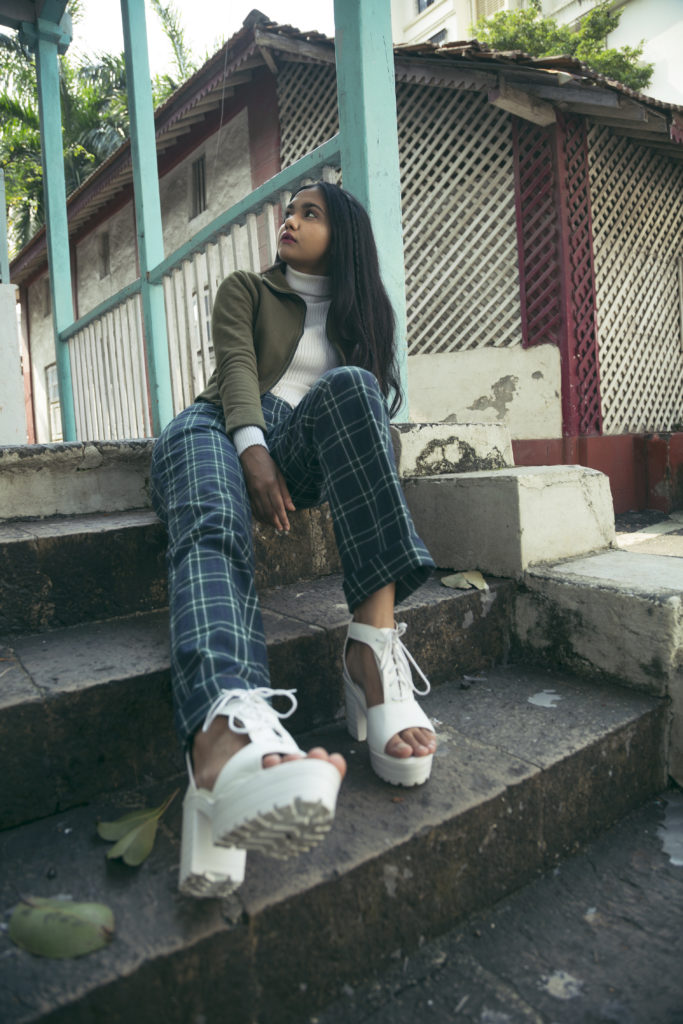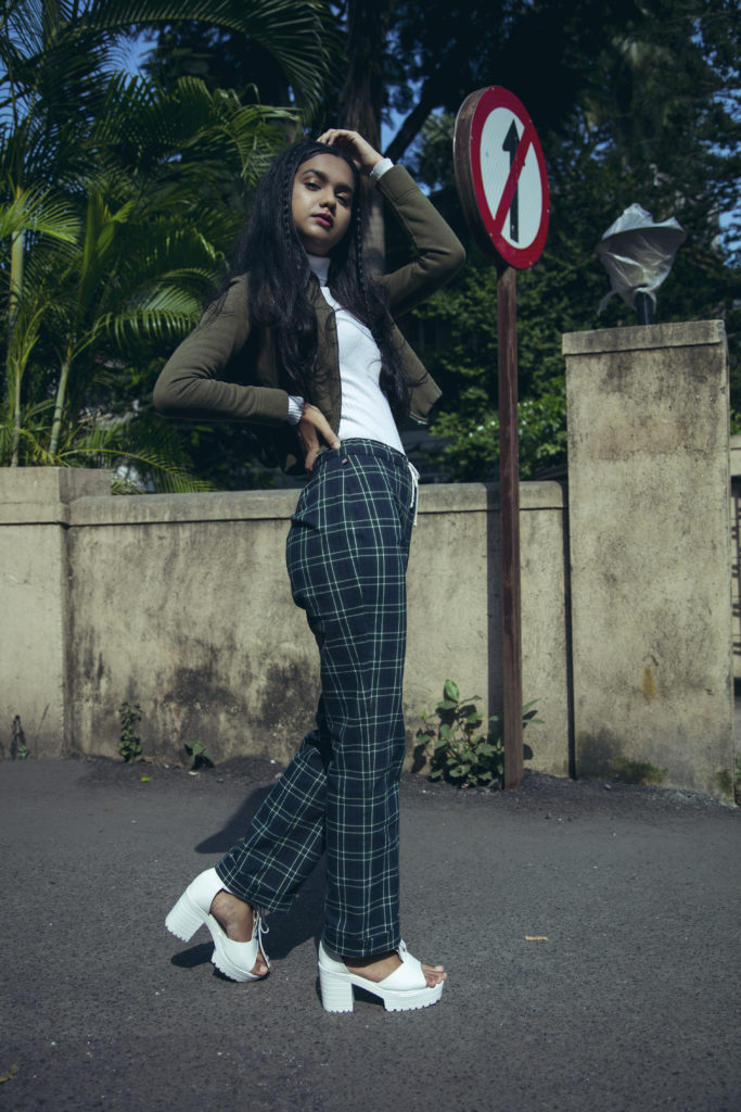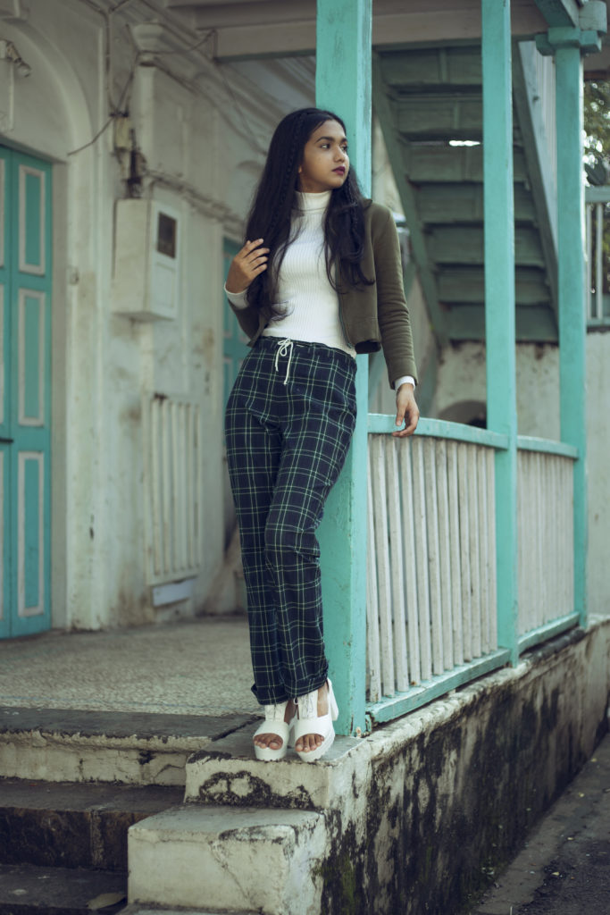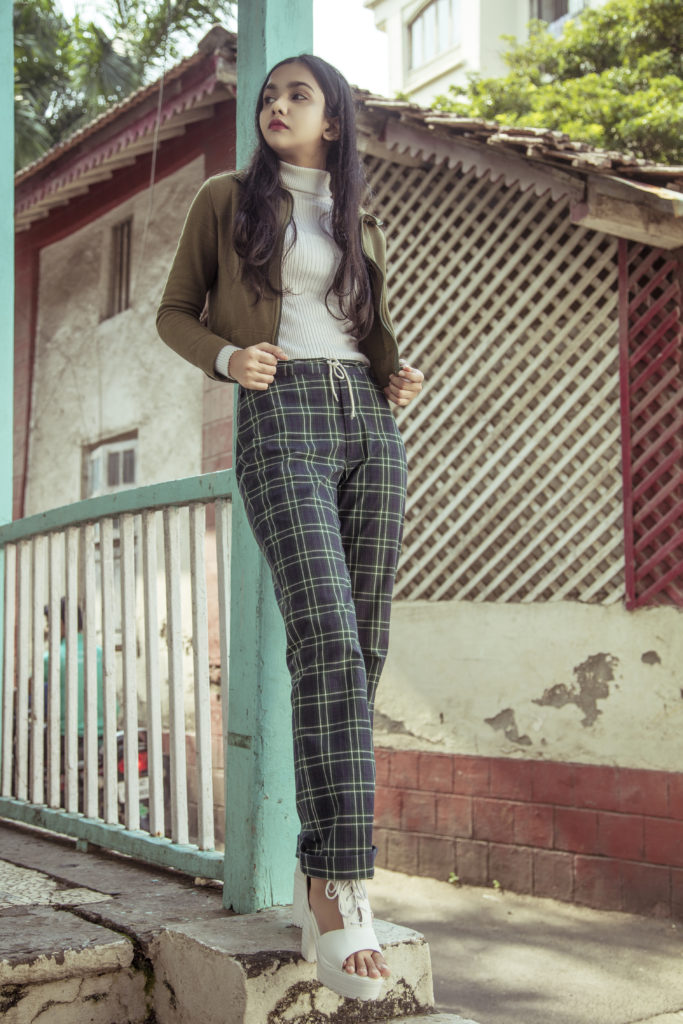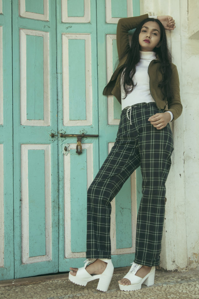 These pants can be styled in tons of different ways but since it’s winter, I paired it with a white full-sleeves polo neck top from forever 21 & an Olive jacket (which I’ve currently been obsessed with). Another thing that you can notice is I’ve played around with just two colors here i.e. green & white but you necessarily don’t need to follow the same. You can pair it with a crop top if you want to show off your midriff or a leather jacket or a denim jacket or just a plain sweater or with anything that you think would look good because experimenting is really fun & I would definitely encourage it. One last thing that I would love to add here is, if the length of your plaid pant is above your ankle or shorter, then you can style some really nice pair of socks with it. I could wear these pants everywhere because they are super comfortable & versatile in their own way.