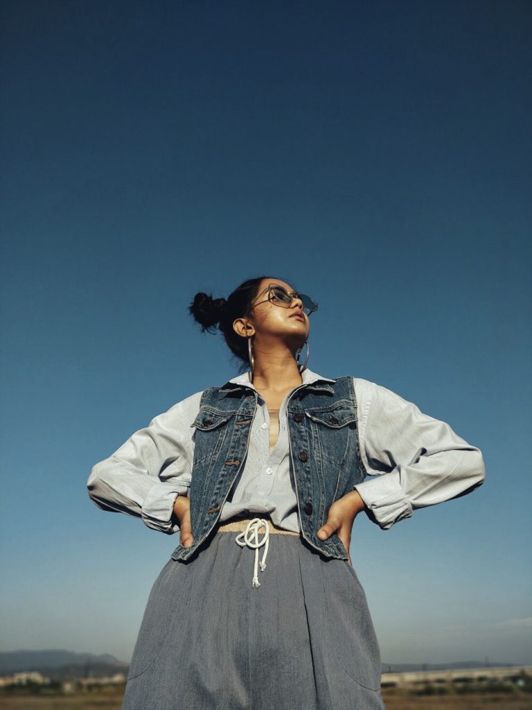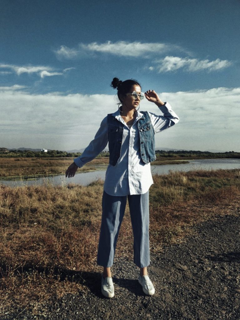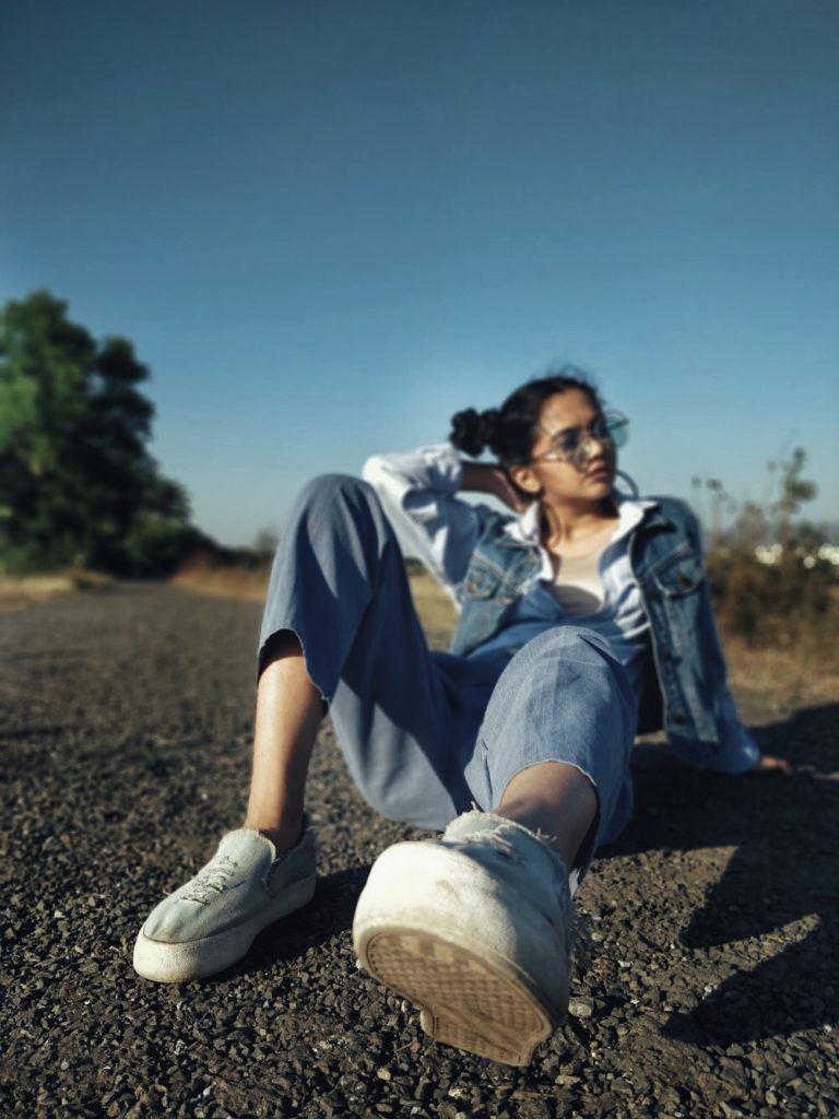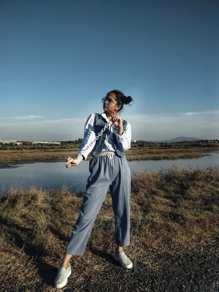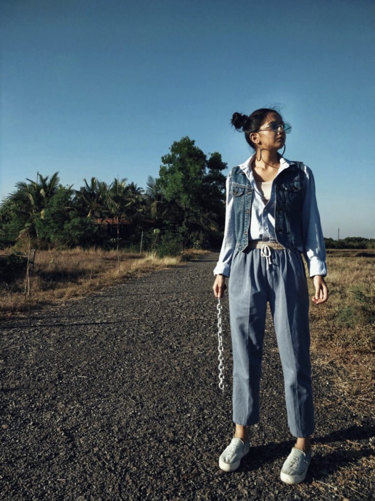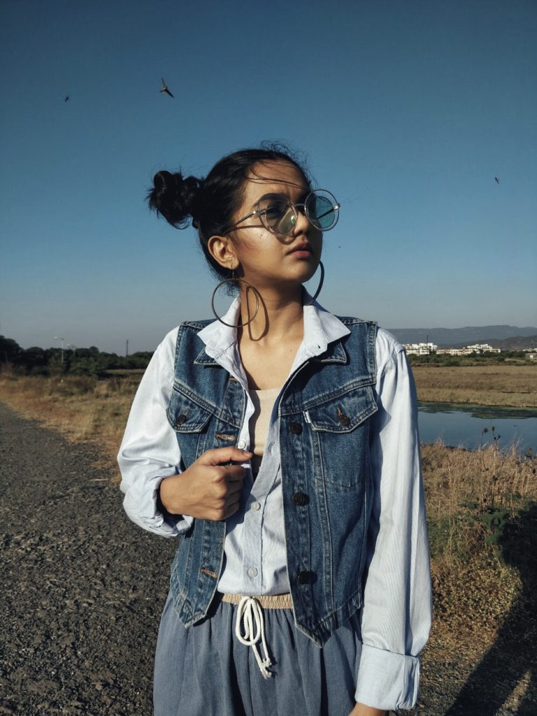I wanted to keep the colour palette relatively light, so I paired all light hues of blue together. I created a look with an over-sized blue shirt (borrowed from a friend), a denim waistcoat, blue ankle length denim pants & denim shoes. Except for the colour, the other thing that’s constant in my outfit is “denim” like literally (including shoes.) Even after keeping the colour & fabric constant, I guess I somehow managed to look sane. Added these really edgy shades & completed the look with two cute buns.