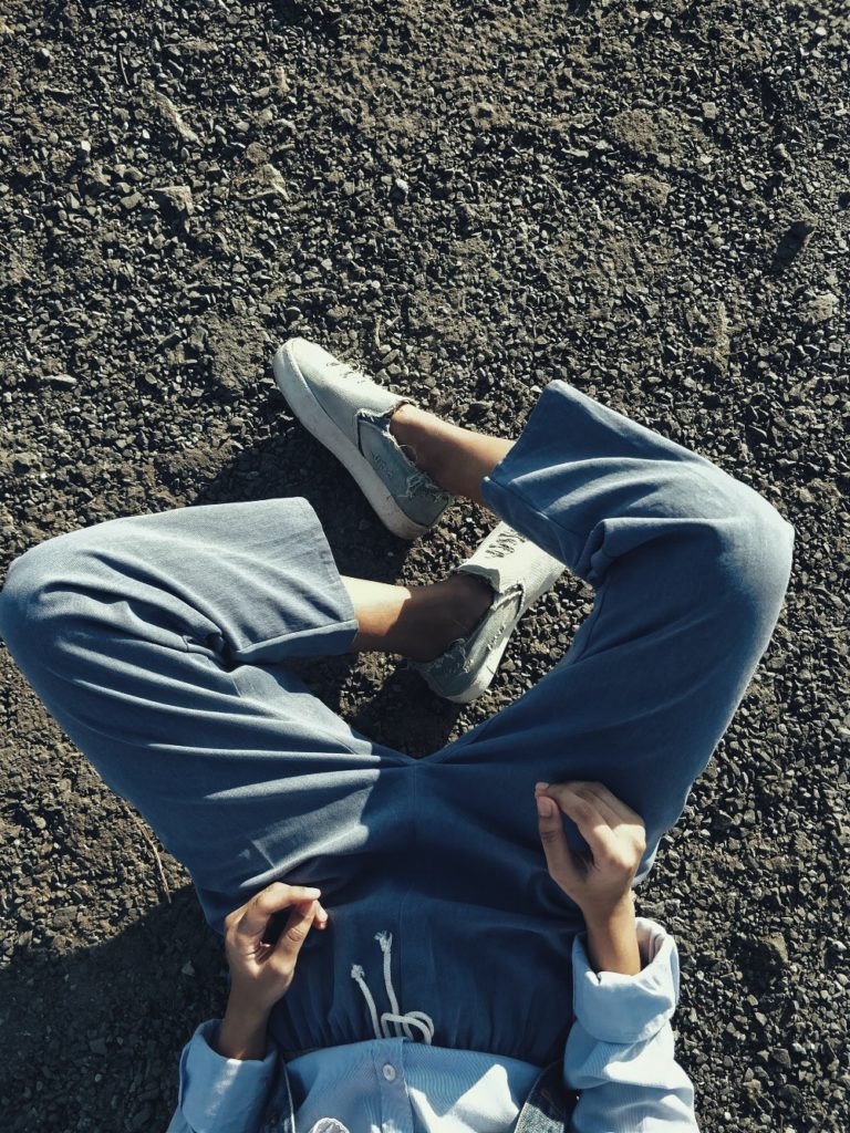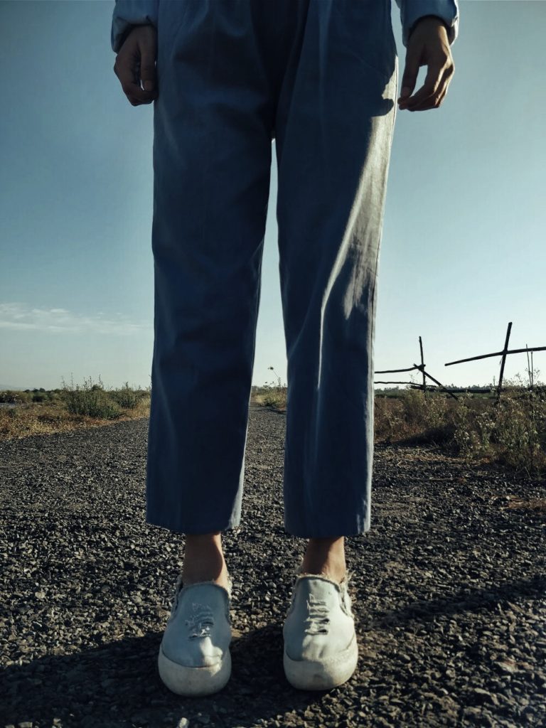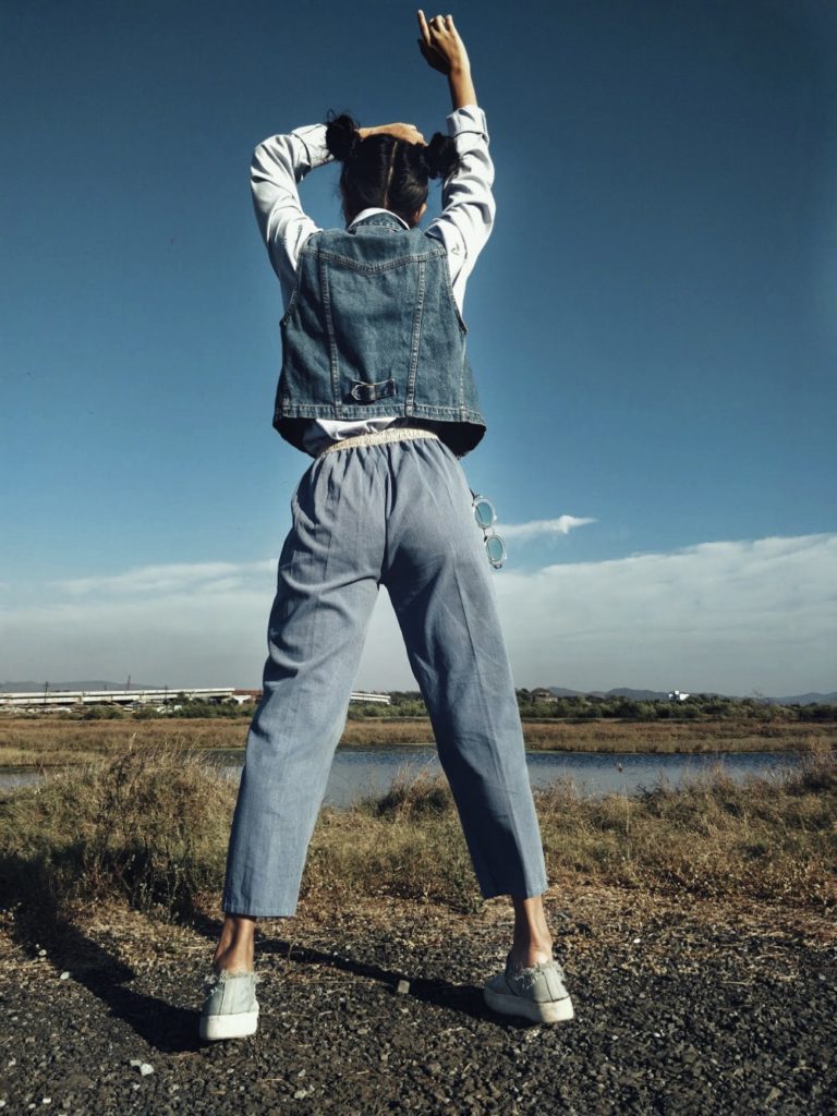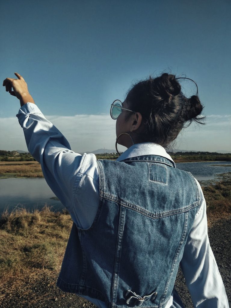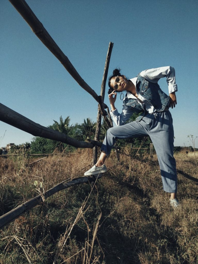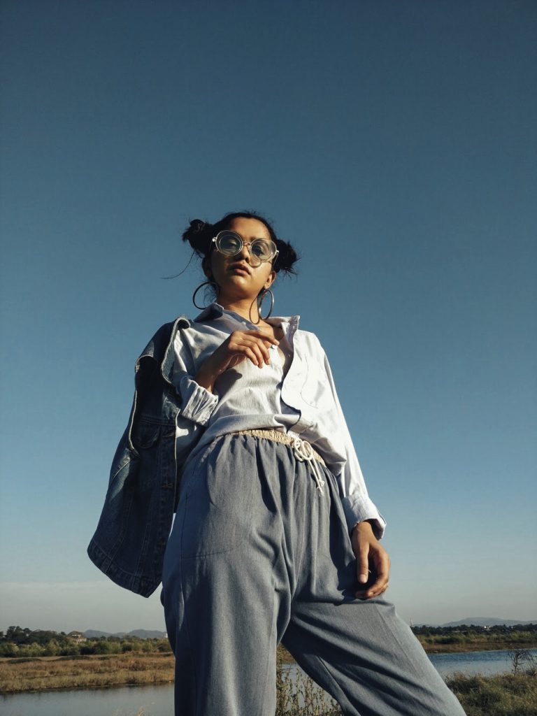 I wanted to keep the colour palette relatively light, so I paired all light hues of blue together. I created a look with an over-sized blue shirt (borrowed from a friend), a denim waistcoat, blue ankle length denim pants & denim shoes. Except for the colour, the other thing that’s constant in my outfit is “denim” like literally (including shoes.) Even after keeping the colour & fabric constant, I guess I somehow managed to look sane. Added these really edgy shades & completed the look with two cute buns.