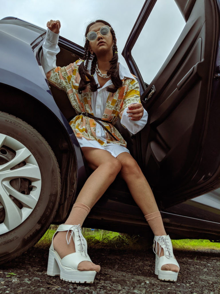 Well, in this look I’ve worn an oversized shirt-dress & then layered it with an oversized shirt. I think the best part of this look is this huge super cool chain (which looks like a dogs chain) & this quirky six braid plaits, styled by my mom.