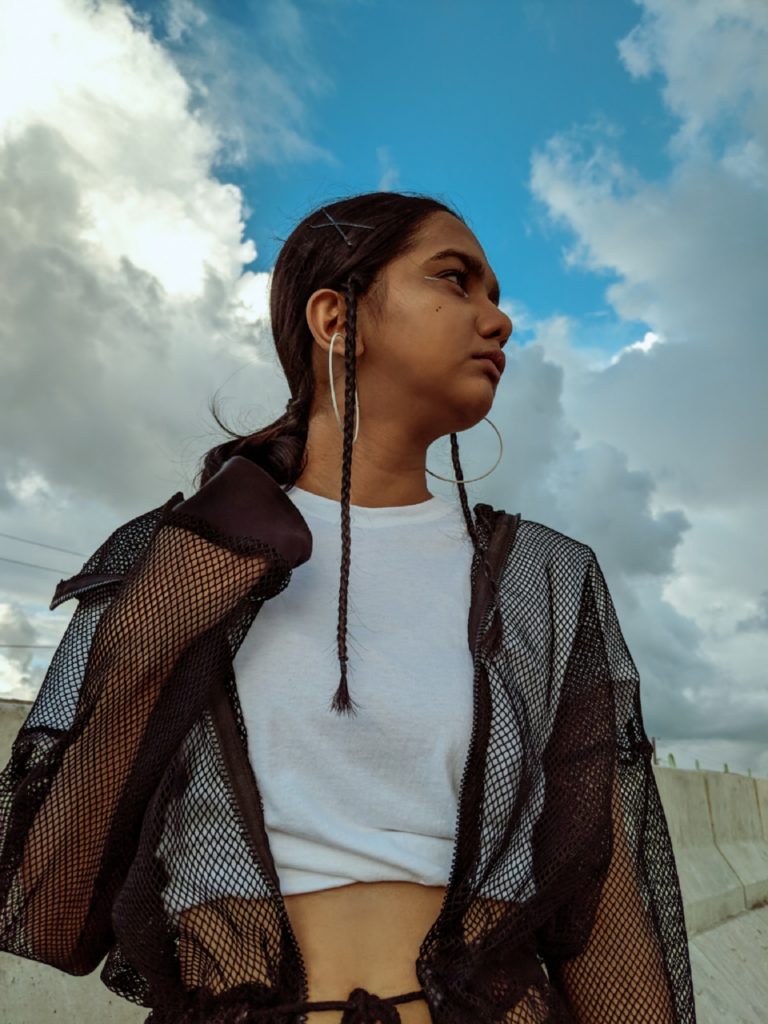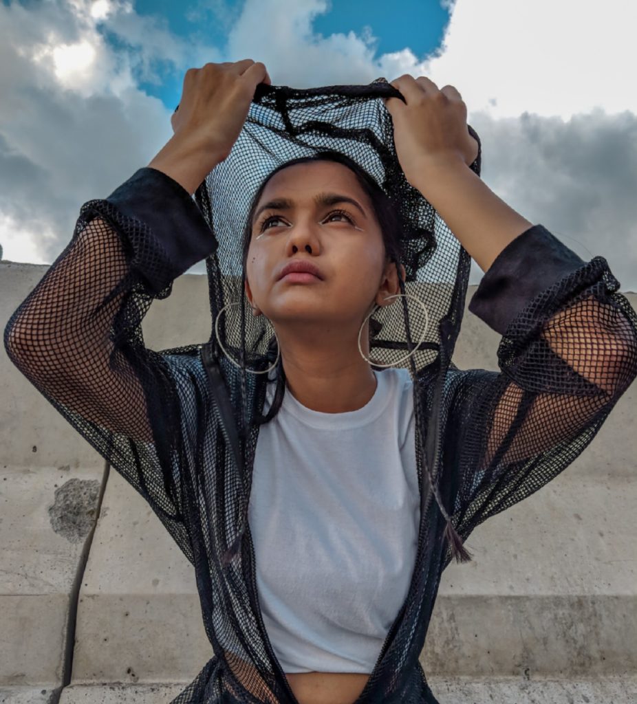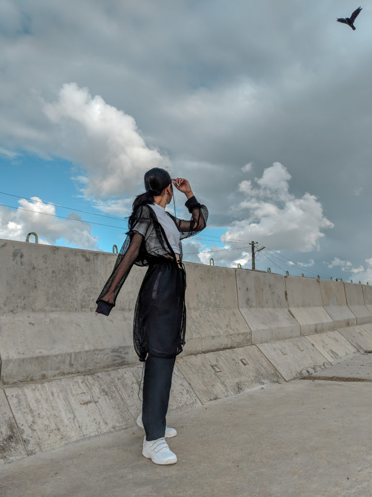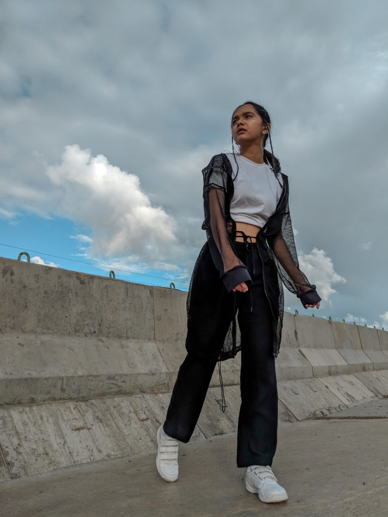 As I didn’t have much time to prepare for the shoot, I went completely basic with my outfit – black pants, white classic T-shirt & Adidas shoes. But I obviously had to add some element of dramatic style here, so I layered this long mesh jacket which also had a hood attached to it. Thought I would keep the hair simple with a basic ponytail but then I braided two really tiny plates in front of my ears which I think complemented the look even more. Last but not the least I tried to experiment with my eye makeup, for a change. Didn’t do anything fancy though, because I wanted a subtle look so I just applied my silver liner on the inner corners of my eyes.