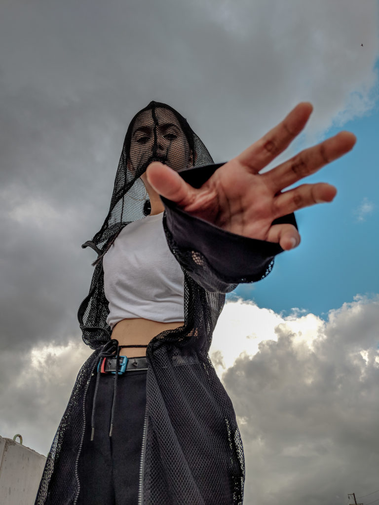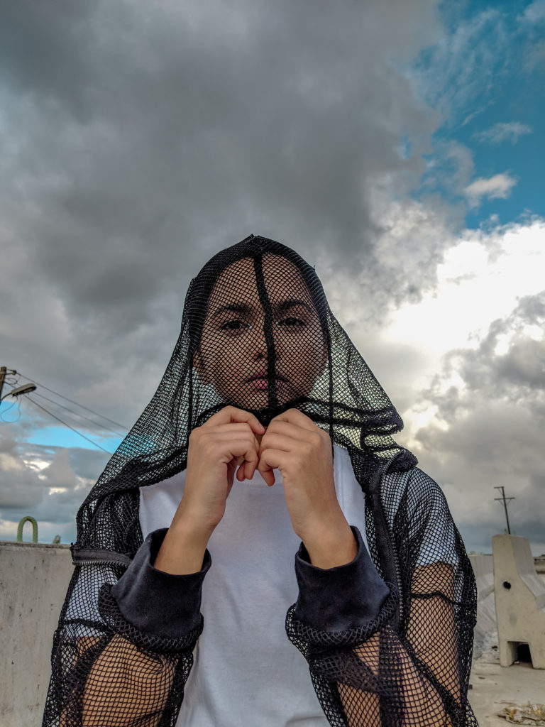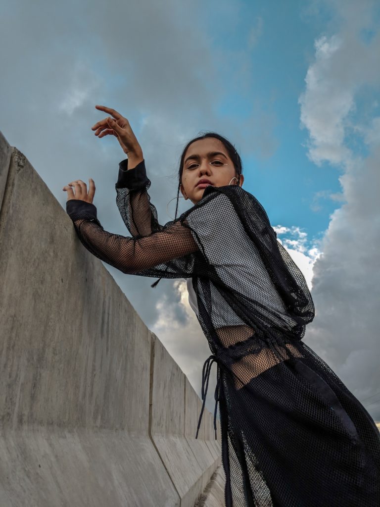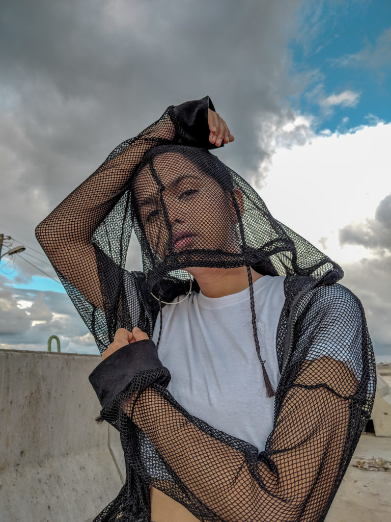 As I didn’t have much time to prepare for the shoot, I went completely basic with my outfit – black pants, white classic T-shirt & Adidas shoes. But I obviously had to add some element of dramatic style here, so I layered this long mesh jacket which also had a hood attached to it. Thought I would keep the hair simple with a basic ponytail but then I braided two really tiny plates in front of my ears which I think complemented the look even more. Last but not the least I tried to experiment with my eye makeup, for a change. Didn’t do anything fancy though, because I wanted a subtle look so I just applied my silver liner on the inner corners of my eyes.