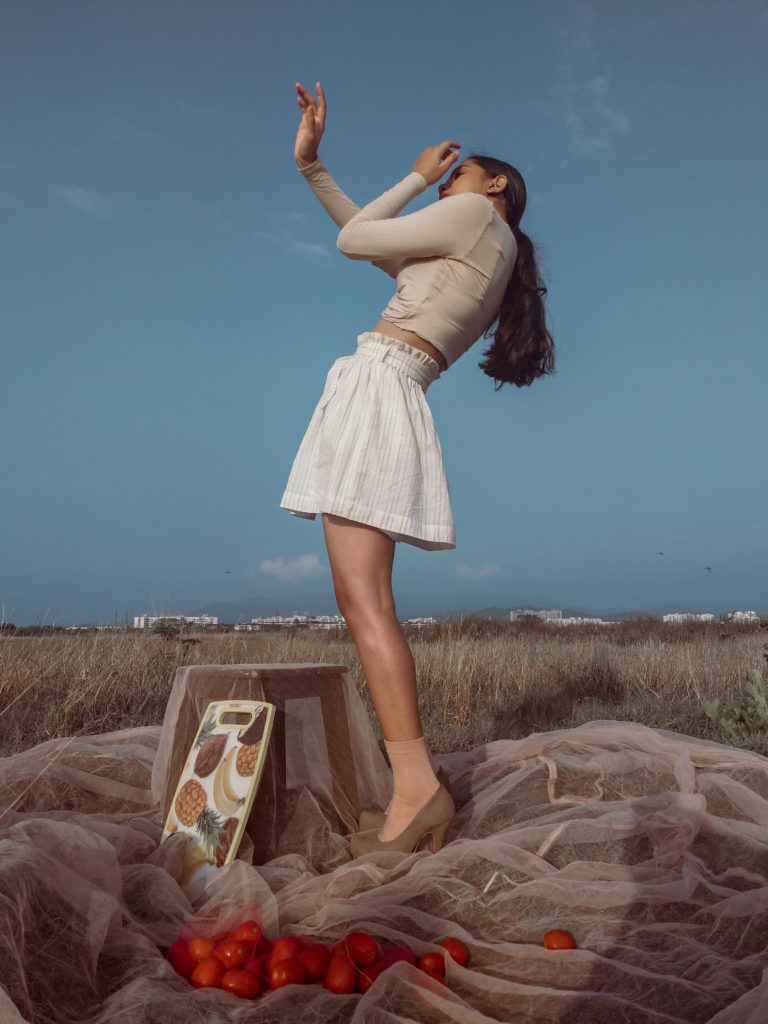 The delightful part about this outfit is how the skirt does all the work of making the outfit look so chic even after pairing it with everything nude, it’s the perfect “chill” day look for all seasons. You can switch the stilettos with something more comfortable and you’re all set for the right day.