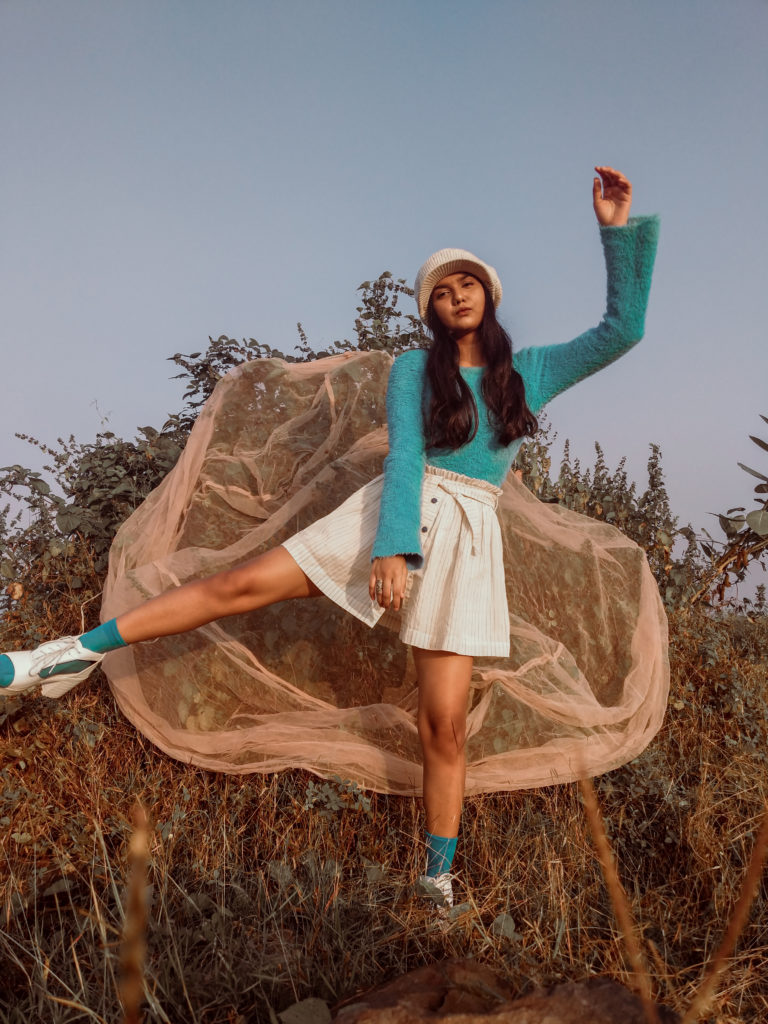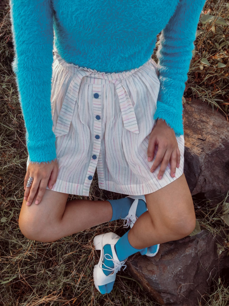 This one’s for all the winter lovers, specially if you love wearing cozy clothes. Because of the various color options on this skirt . Since this skirts has different colored stripes on it you can play around with one of the colors. I choose to stick to blue because I wanted to pair this really cute and furry blue top which is just perfect for the winters. To jazz the look a bit I styled a Barret and blue socks with white high tops or heels.
